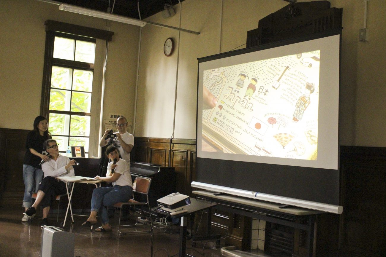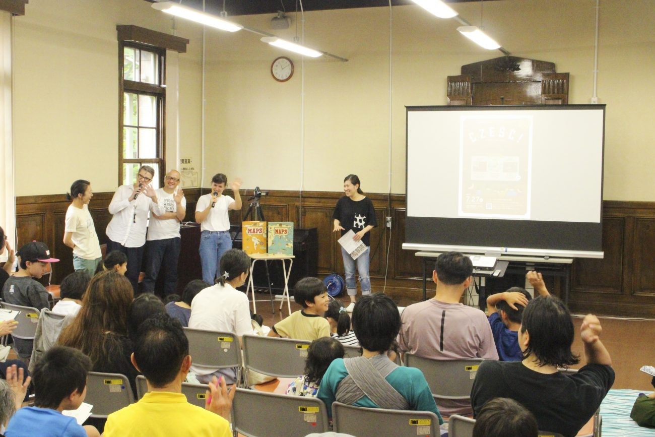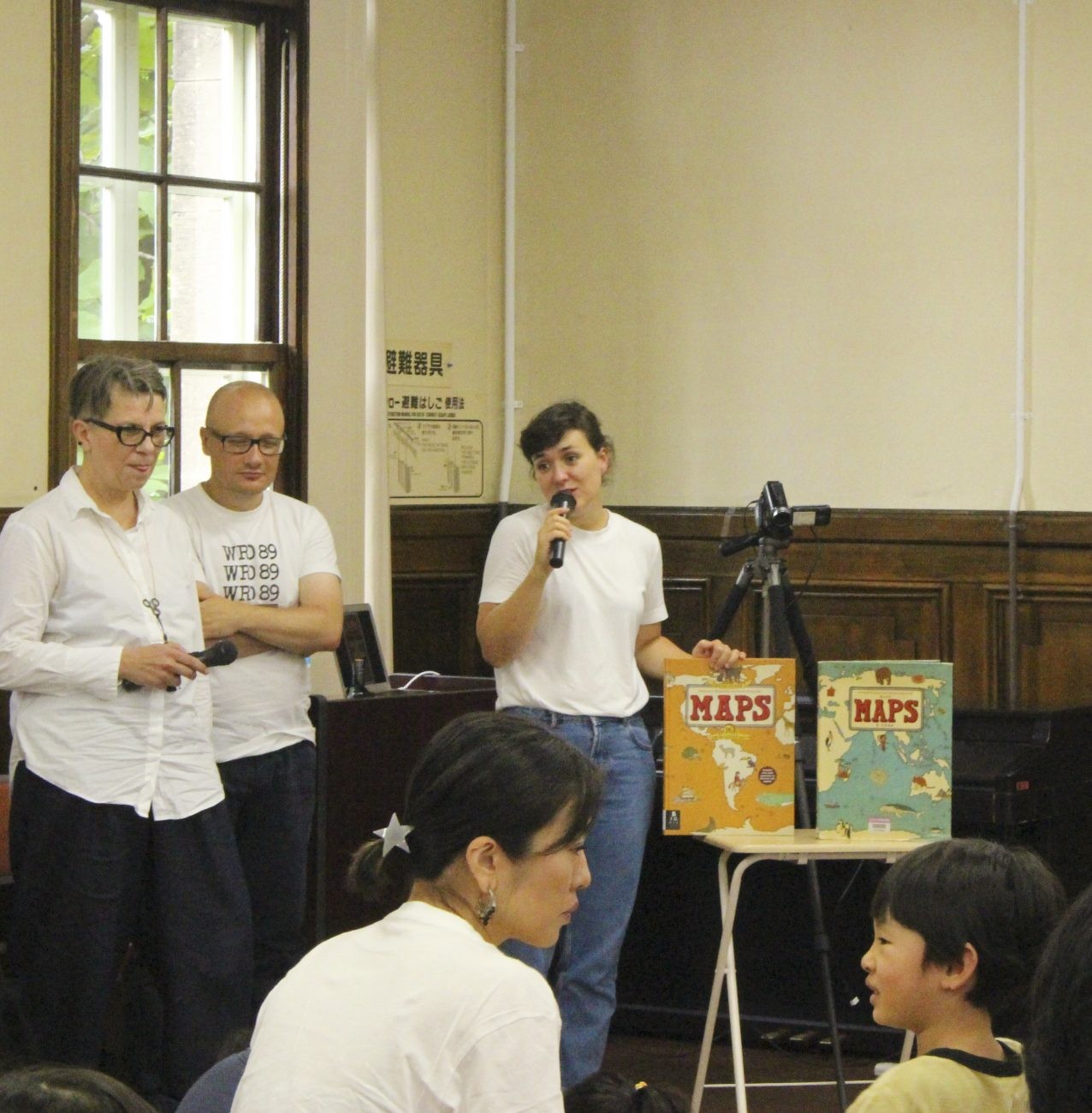 食べ物や動物、歴史的な建物などたくさんのイラストが詰まった42カ国の地図の絵本『マップス:新・世界図絵』(作・絵:アレクサンドラ・ミジェリンスカ&ダニエル・ミジェリンスキ)が登場。本の中身をカメラを通して、大きくスクリーンに映し、ポーランドと日本の同じところと違うところを会場のみんなで探しました。