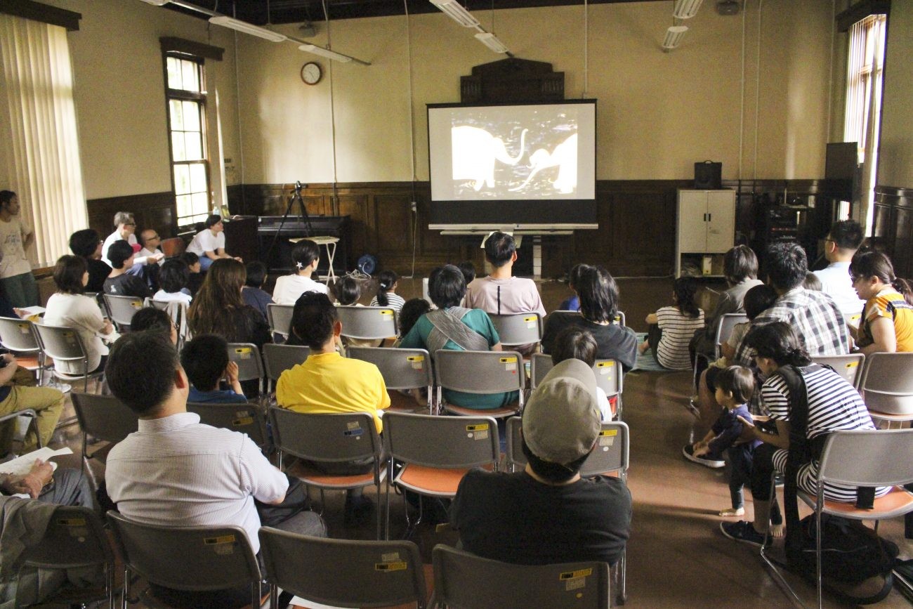 会場が少し暗くなり、子どもたちはドキドキワクワク、映像が映し出されるとスクリーンに釘付けでした。