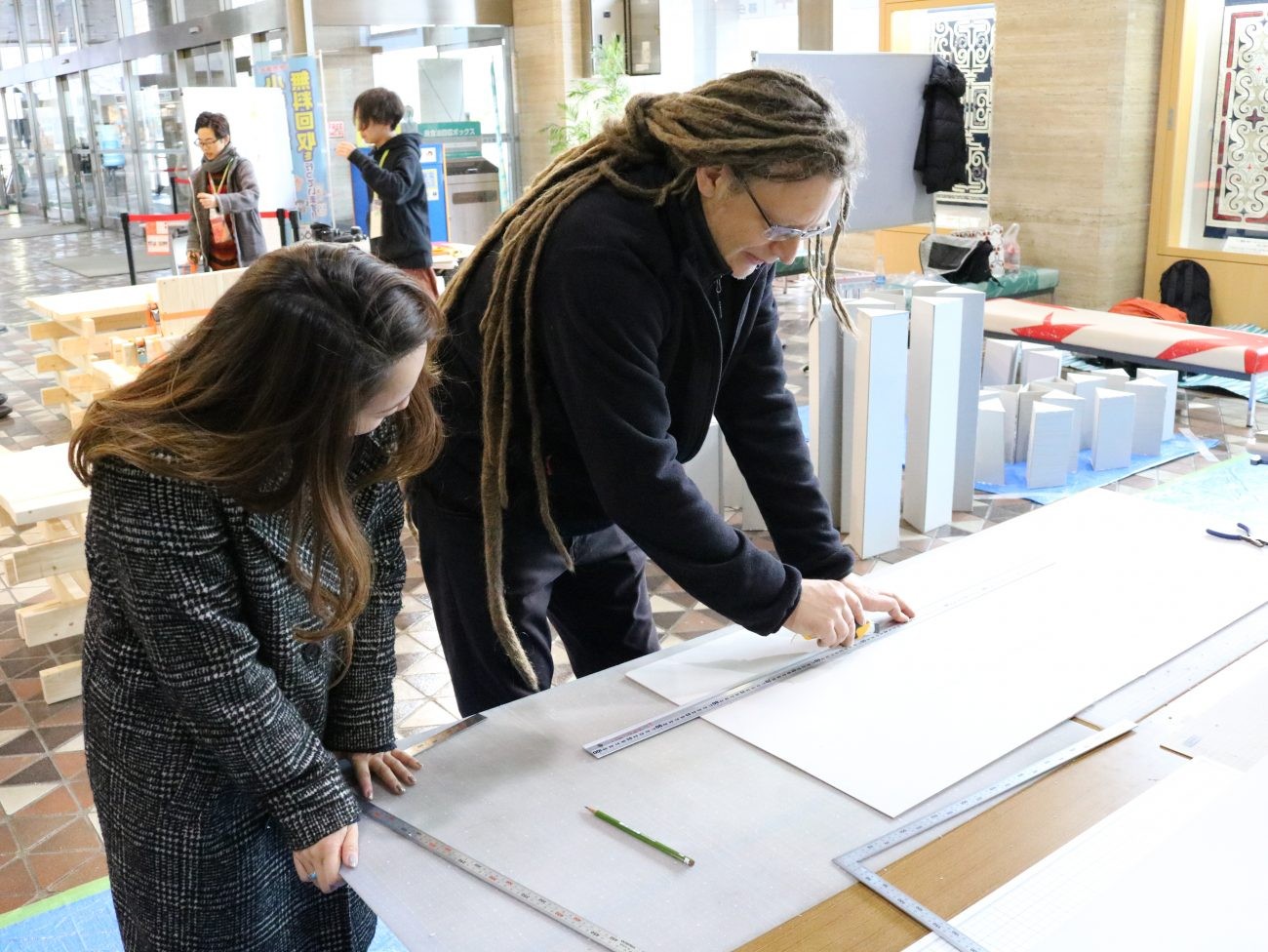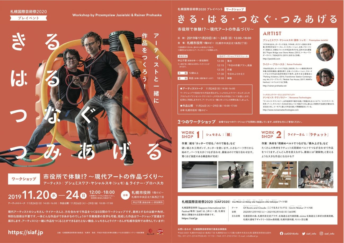 2019年11月20日~24の5日間、に札幌市役所において現代アーティストのシェモさん、ライナーさんと共に作品を作り上げるワークショップ「きる はる つなぐ つみあげる 市役所で体験!?~現代アートの作品づくり~」を開催しています。
