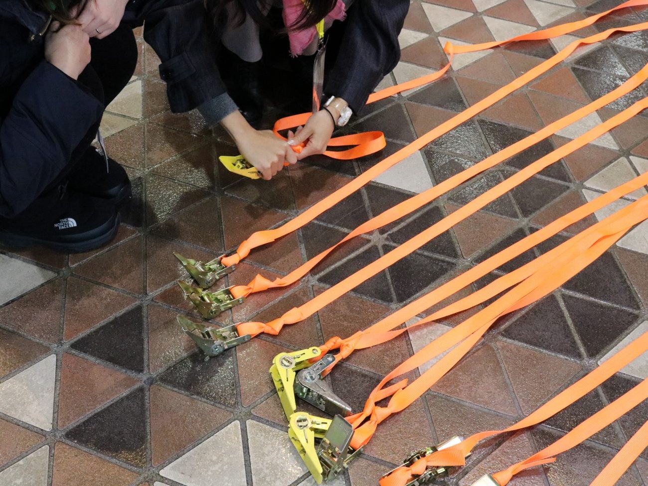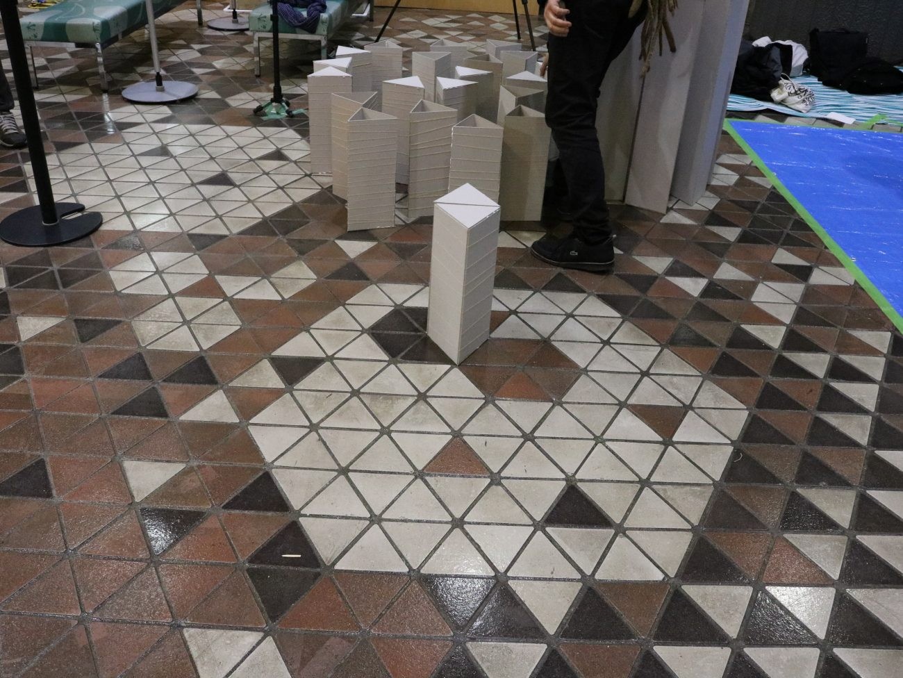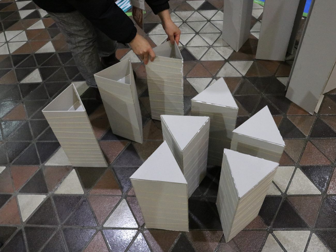 実は制作物のパーツは市役所の床のタイルと同じ形・サイズで作られています!それを複数個組み合わせる事で様々なものに変身させるという作品を制作していました。