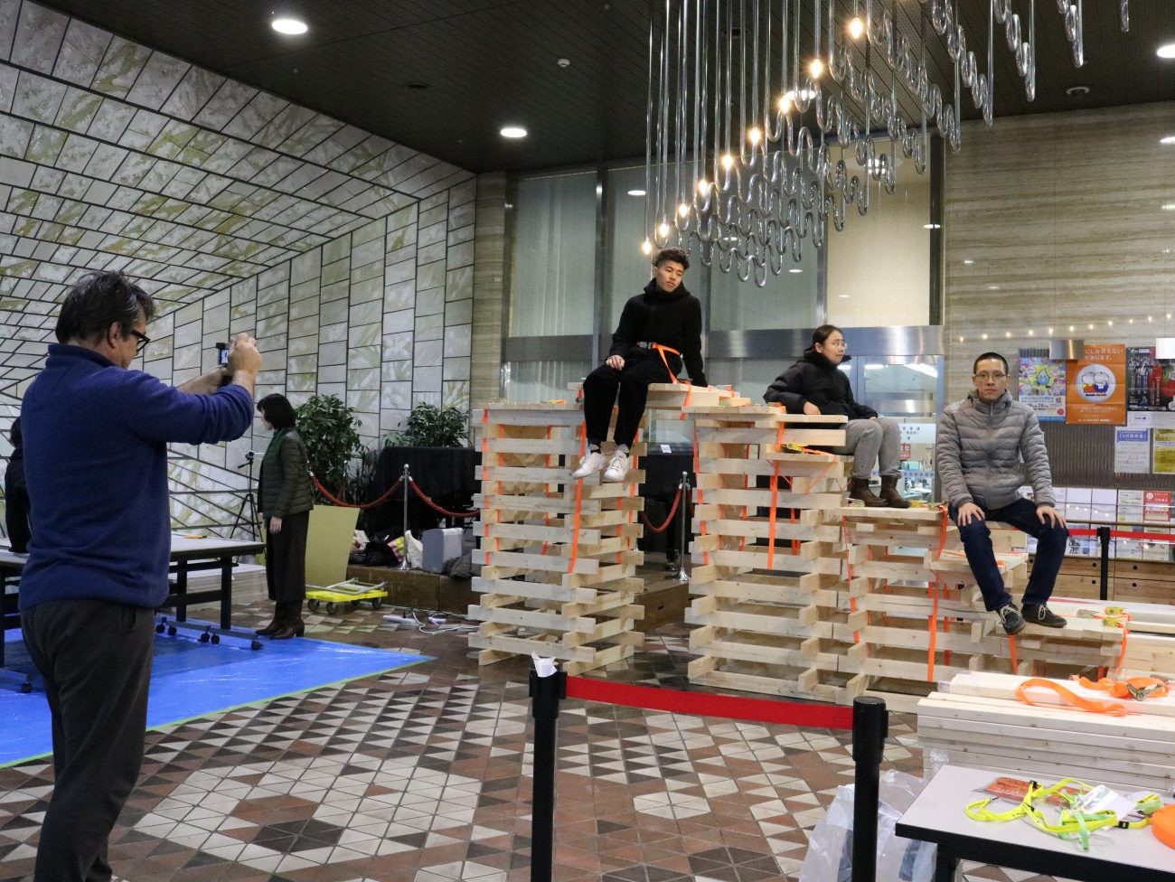 三角柱にするとかなりの強度になるので完成後どのような作品になるのか楽しみです。シェモさんも参加者と一緒に作業をすすめます!