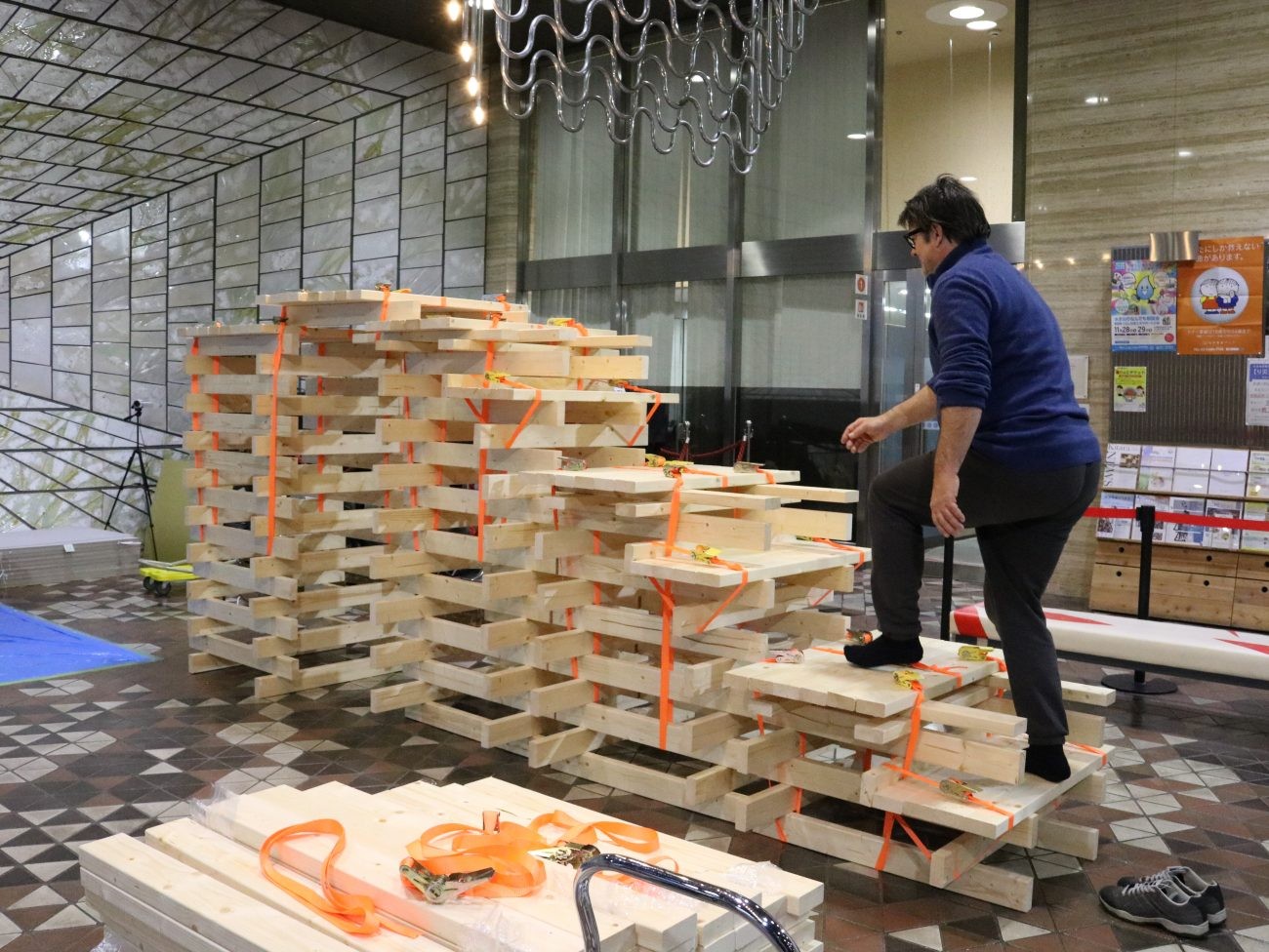 角材を積み上げ、つなぎ合わせるだけで人が乗ってもビクともしない階段が出来上がりました。完成した作品に上るライナーさん。