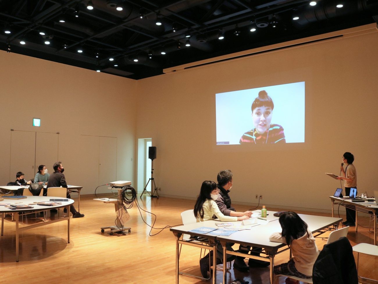 ワークショップの最初は、モエレ沼公園の紹介。この下にたくさんのごみが埋まっていることや、災害に対応するために作られた公園であること、そしてイサム・ノグチがモエレ沼公園に託した思いなどをSIAF2020キュレーターでモエレ沼公園の学芸員でもある宮井さんが解説。参加した子どもからはさっそく「知らなかった!」という声が聞かれました。続いて、まだ朝6時のポーランドとオンラインでつなげて、マグダレナさんが登場。「アートメディエーション」についての説明がありました。