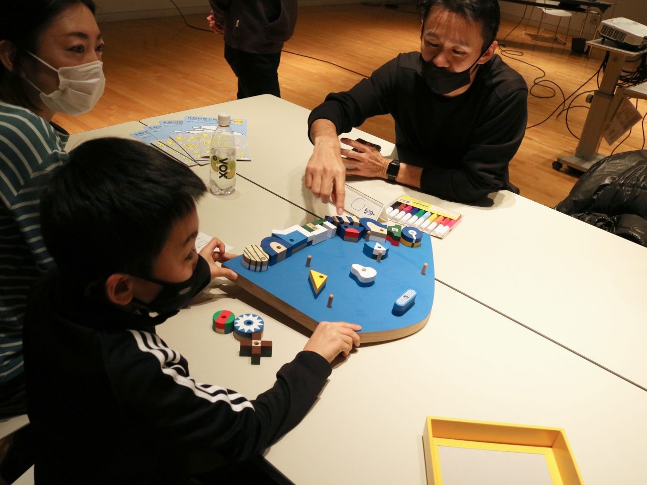次は「動物」、続いて「植物」。ボードの面にも、突起にも、もちろんブロックの種類にも限りがあります。しかし、参加者が描くイメージと、実際に作り出される「かたち」に限りはありません。また、創造力・想像力は作る人にも必要ですが、何を作ったのかを当てる側にも求められ「泣いている顔?」「ここが木の幹!」「かわいい!」など、家族間はもちろん、企画者、スタッフも加わった自然な言葉の交換と思いの共有が促されていきます。