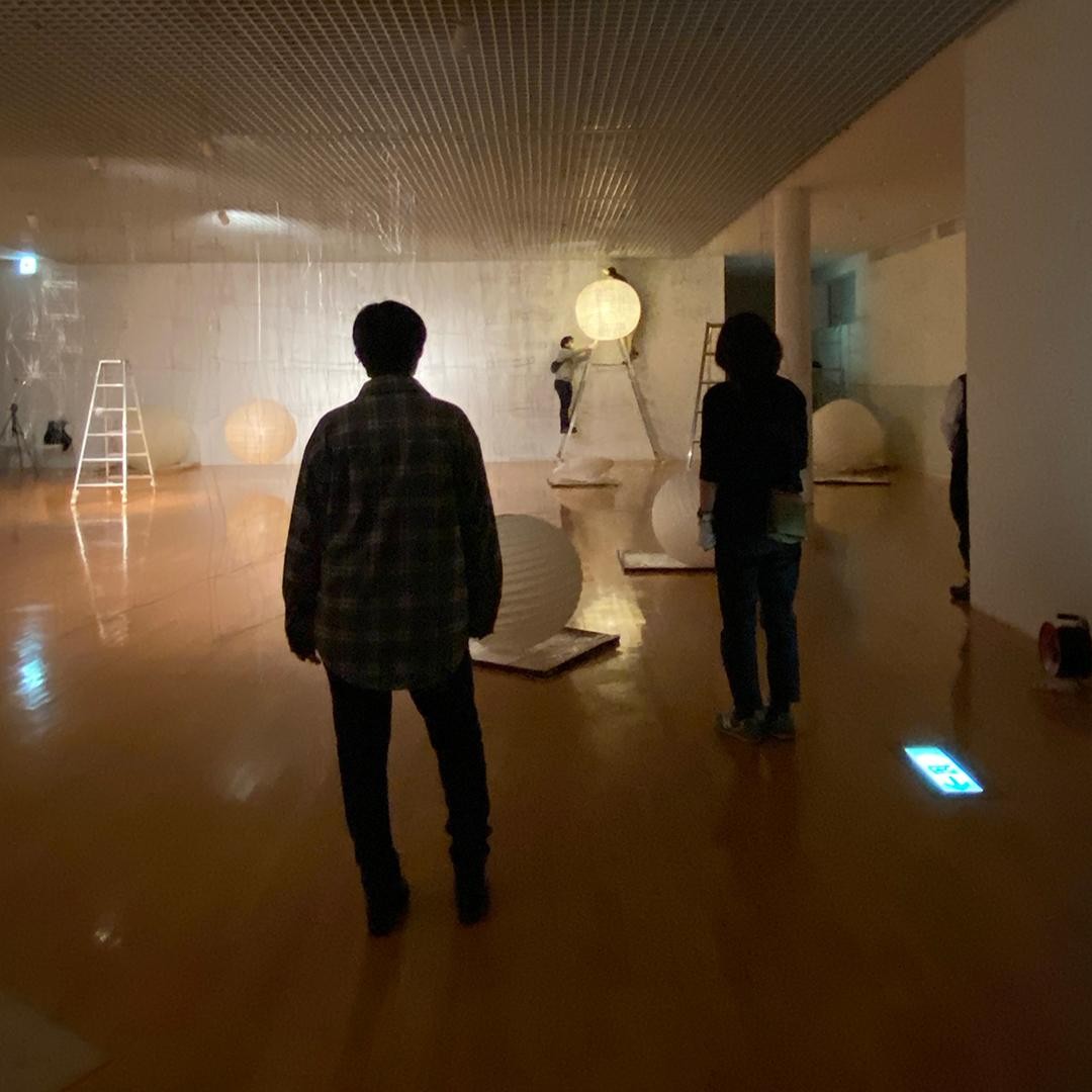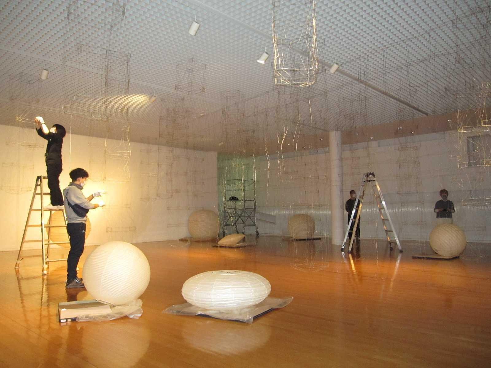 川上さんの作品とイサム・ノグチの《AKARI》との共存のための試行錯誤が行われていました。位置関係だけではなく、光量や角度など多くの要素が影響する繊細な作業が続いていました。
