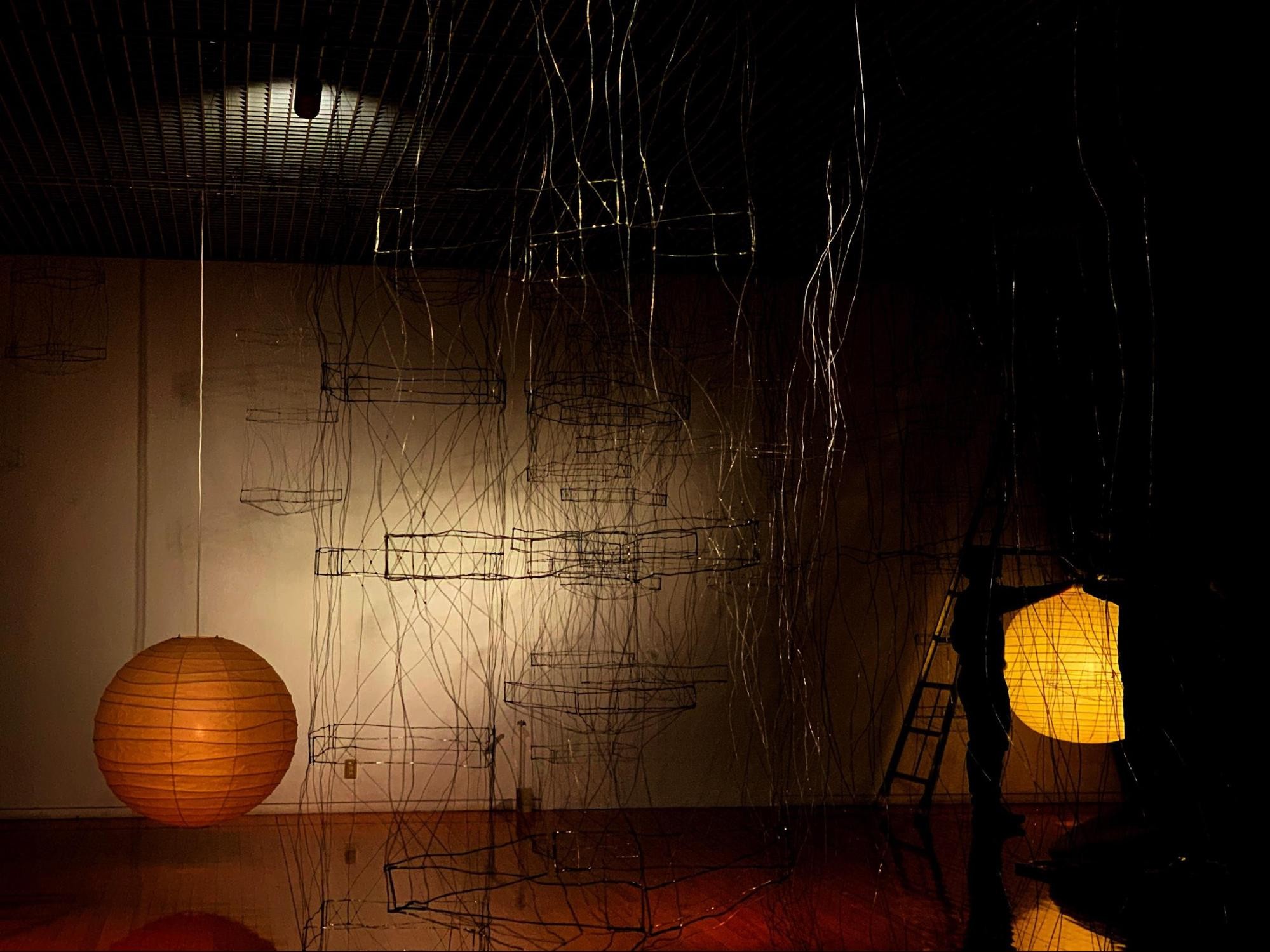 初めて川上さんにお目にかかり、涼やかで爽やかな優しさ、理知的な人柄に触れることができ、この方だから作り出せる繊細で、広がりのある世界がそこにあるのだと、作家と作品がやっと一致。作品への興味はマックスへ。スペースにはこれからセットされるであろうスポットライトや作業の脚立や工具、散乱ゴミ、そして出番を待つ《AKARI》達。