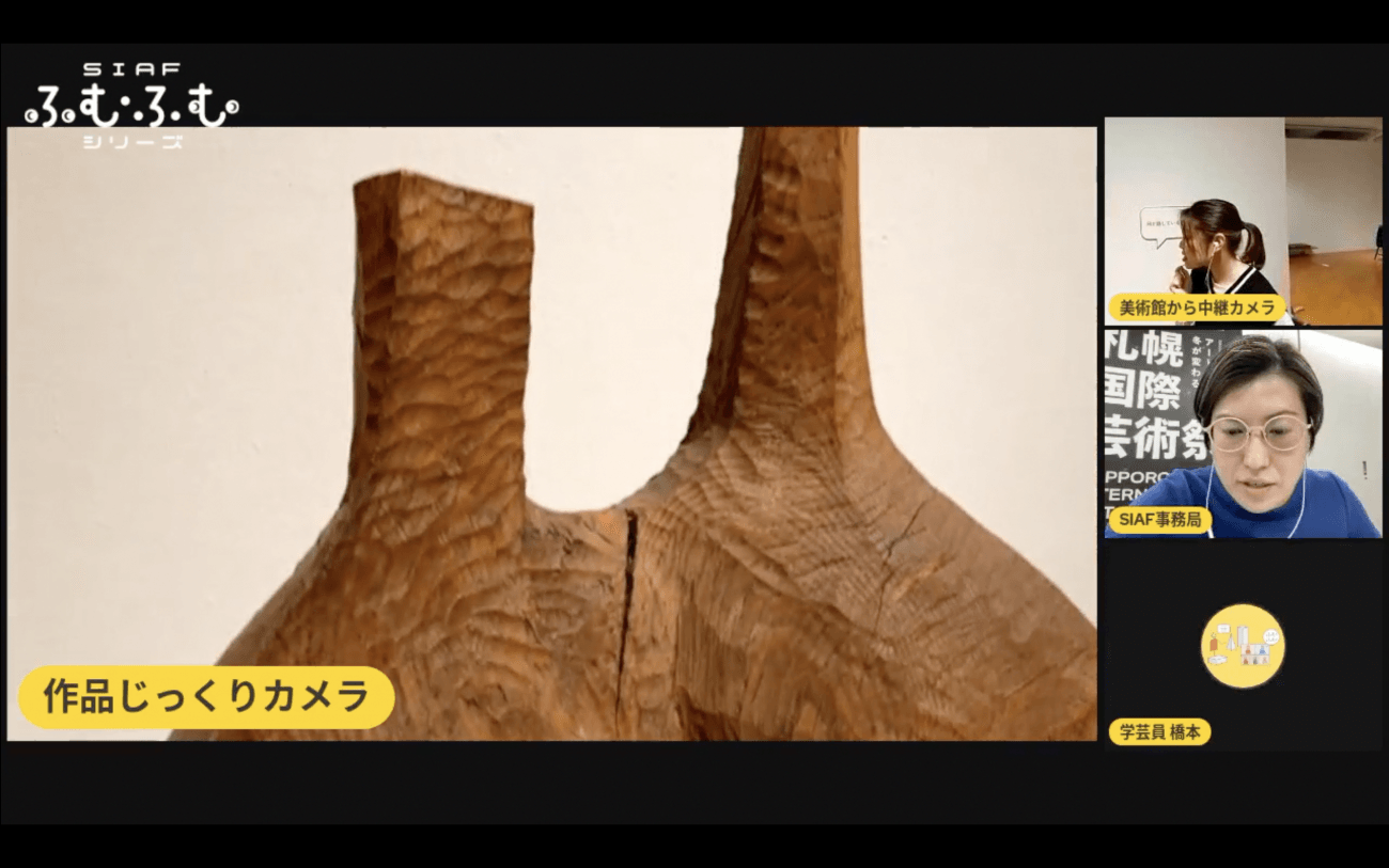 「作品じっくりカメラ」では、作品に近づいて撮影。現場で意外に見つめ込まないような部分や色合いにカメラがフォーカスすることで、参加者のみなさんも作品のディティールを追うことになります。意外と気づかない「素材」や「表情」がじっくり見られたのではないでしょうか。