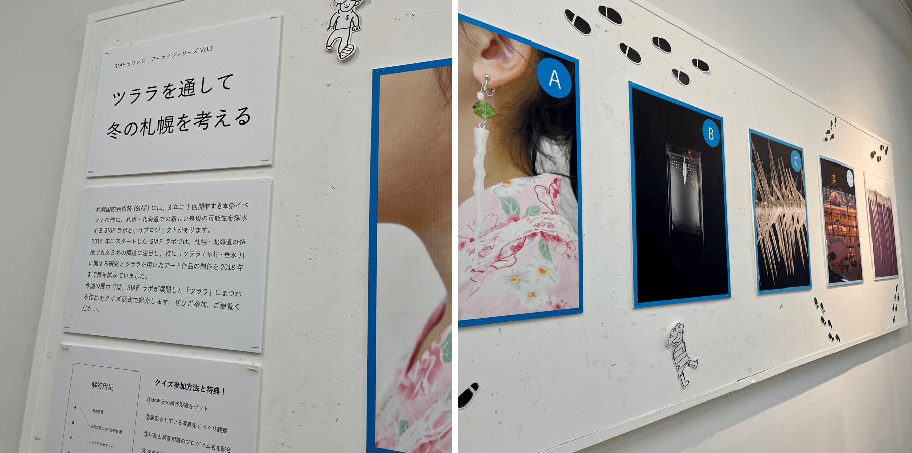 ラウンジでは昨年から引き続き、SIAFアーカイブを使ったクイズ企画を実施中です。現在のテーマはいまの季節にぴったりな「ツララを通して冬の札幌を考える」。2016年~2020年、SIAFラボがツララをテーマにさまざまな活動を展開したプロジェクト「ツララボ」にまつわるクイズです。当時のようすを知る人もそうでない人も、気軽に参加できる内容です。全問正解すると併設カフェのドリンクメニューが100円引きになってお得プライスに。「去年クイズやったよ」というみなさんの再チャレンジもお待ちしています!