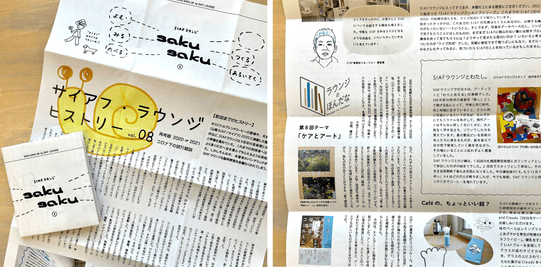 そのほか、企画編集デザインのすべてをラウンジスタッフが担当しているフリーペーパー「sakusaku」の第8号が発行されました。ラウンジの知られざる歴史からおすすめ書籍(テーマは「ケアとアート」)、元スタッフによる回想までバラエティゆたか。バックナンバーはSIAFラウンジのウェブサイトでも公開中です。