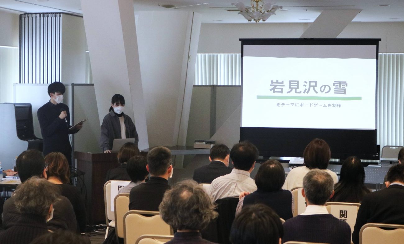 岩見沢の雪をテーマにして制作したボードゲーム「ユキナマラ」について発表していただきました。雪が降ると、「除雪が必要」、「交通機関が麻痺する」、「犬の散歩が大変」など雪に対してネガティブな感情を抱いてしまいがちですが、それを逆手にとりゲームを通して面白おかしく雪と触れ合うことができたらという視点から、ゲーム制作に取り掛かったそうです。