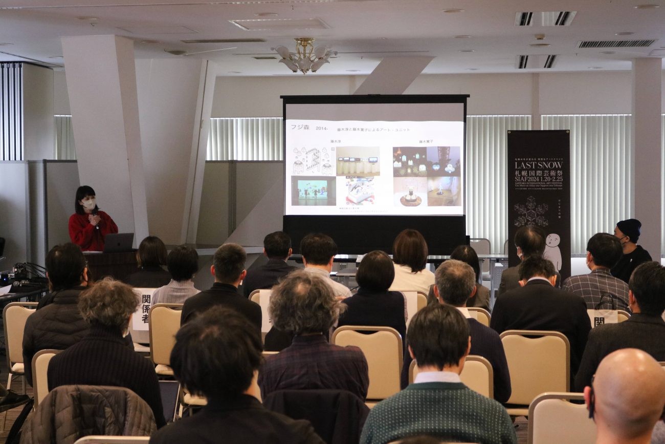 夫の淳さんと札幌を拠点にアートユニットとして活動されている藤木寛子さん。札幌芸術の森美術館で展示された《オンとオフ》など、これまで手掛けてきた作品について紹介いただきました。SIAFスクールでは、小中学生を対象に、プログラミングを活用して自分だけの雪の結晶を制作できるワークショップにも携わっていただく予定になっています。