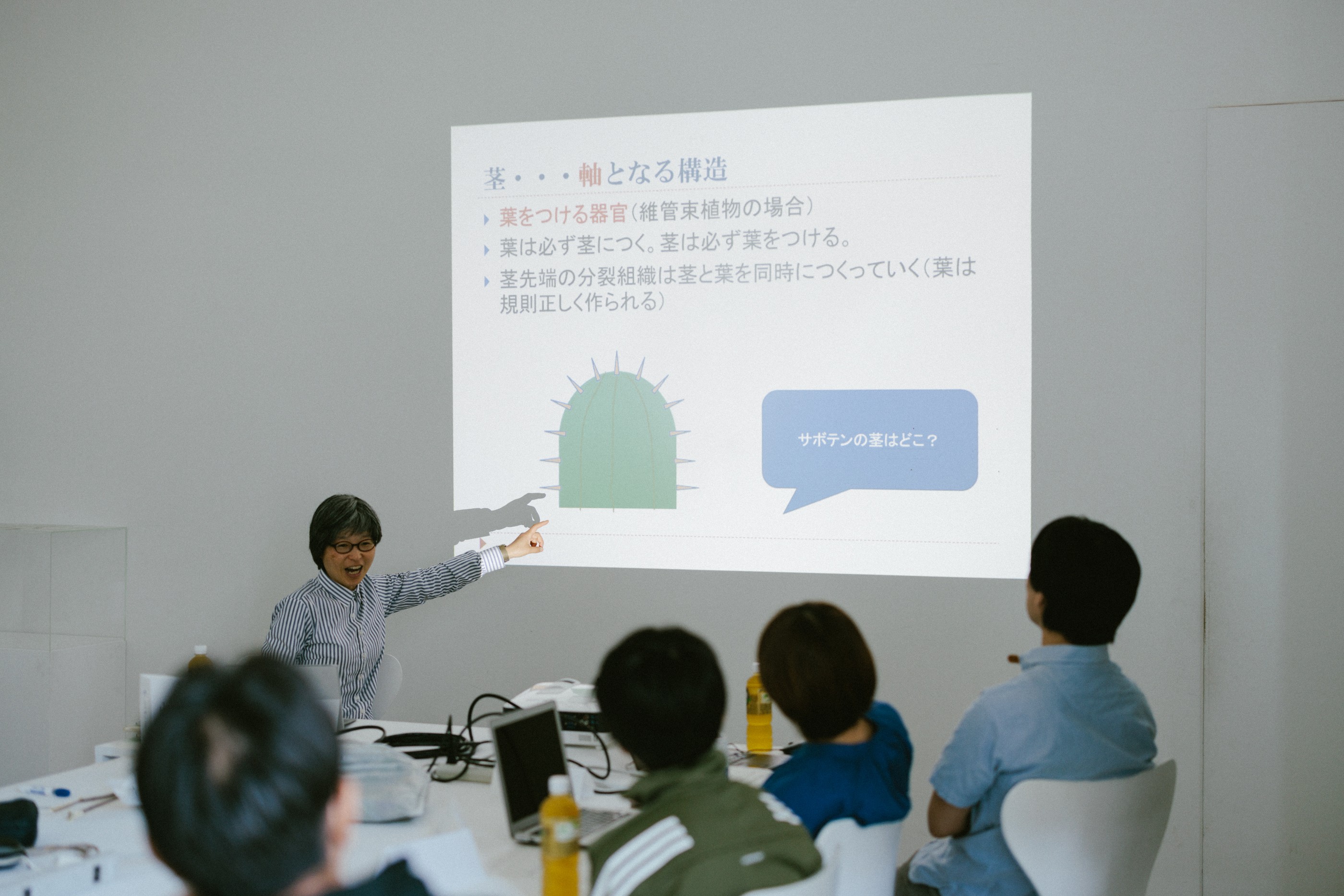 植物は、分類するために世界共通のルールが整備されているとのことで、「茎」、「枝分かれ」、「葉」の部分の構造のルールについて学びました。植物の体の軸になるのが茎、葉は必ず茎につく、茎は必ず葉をつけるということを学んだ後で「ではサボテンの茎はどこでしょう?」と山崎さんから問いかけられると、参加者の方は悩みながらもそれぞれに回答。