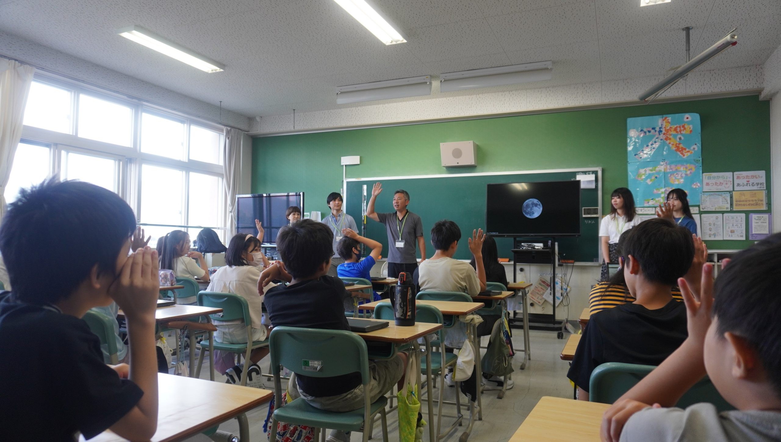 始めにSIAFスタッフから札幌国際芸術祭の紹介をしたあと、クイズ形式で「星」について学びます。「月は星?」「星はなぜ光っているの?」「星の色の違いの理由は?」「星はなぜ瞬くの?」など、身近にあるけれど意外と知らない「星」の性質に児童のみなさんは驚きながらも、積極的に発言してくれました。