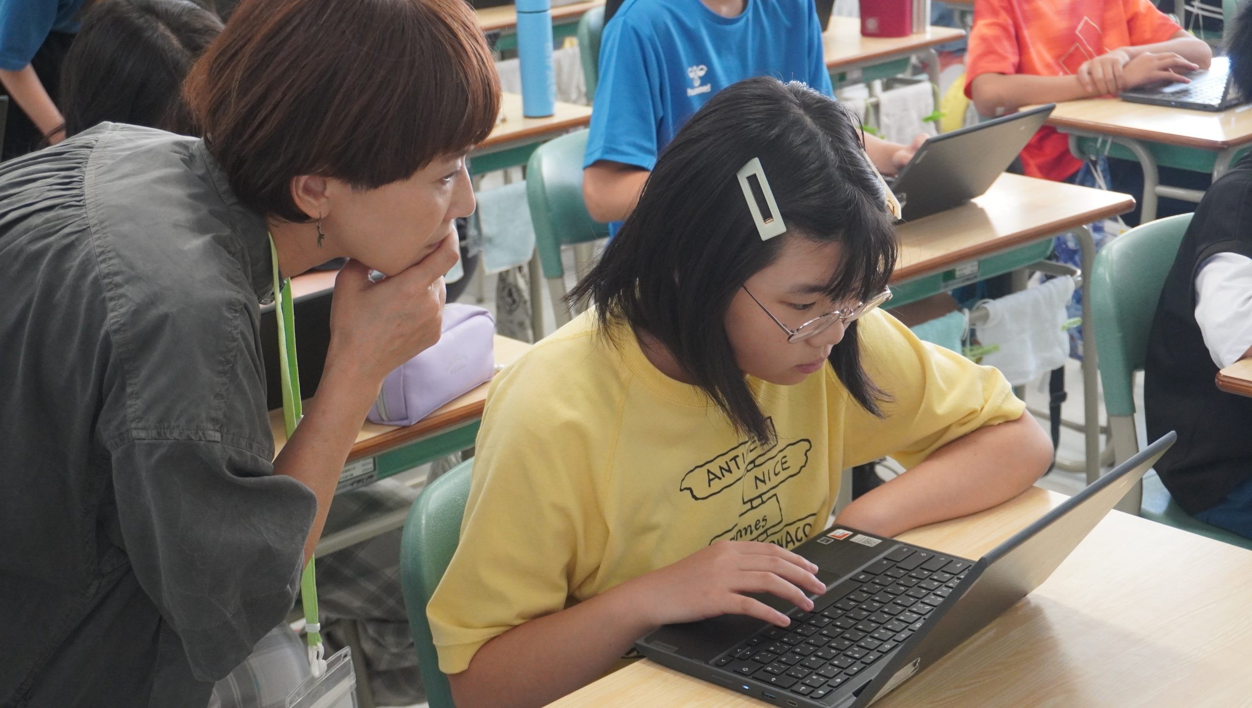 自分で文字を打ち込むプログラミングという初めての体験に、始めは難しく感じていた様子の児童のみなさんですが、フジ森さんの丁寧なレクチャーのもと、悩みながらも凄まじい集中力であっという間に創作を進めていきます。