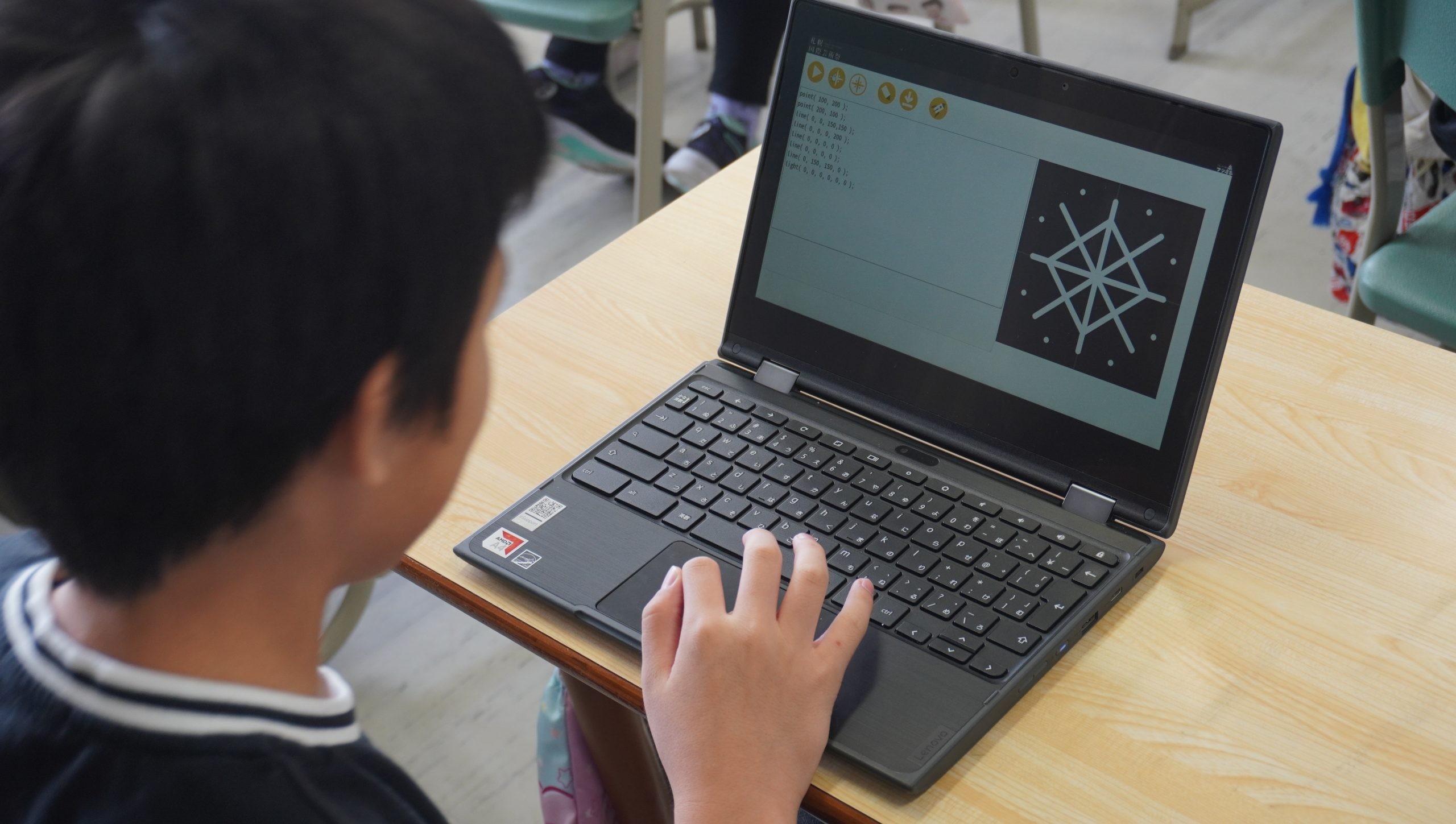 初めは感覚的に数字の入れ替えをしていた児童も、「ここに線を引きたいからこの数値を入力しよう」と論理的につくれるように。2時間にわたる授業となりましたが、休み時間も自主的に取り組み続けるほど夢中になって創作してくれました。