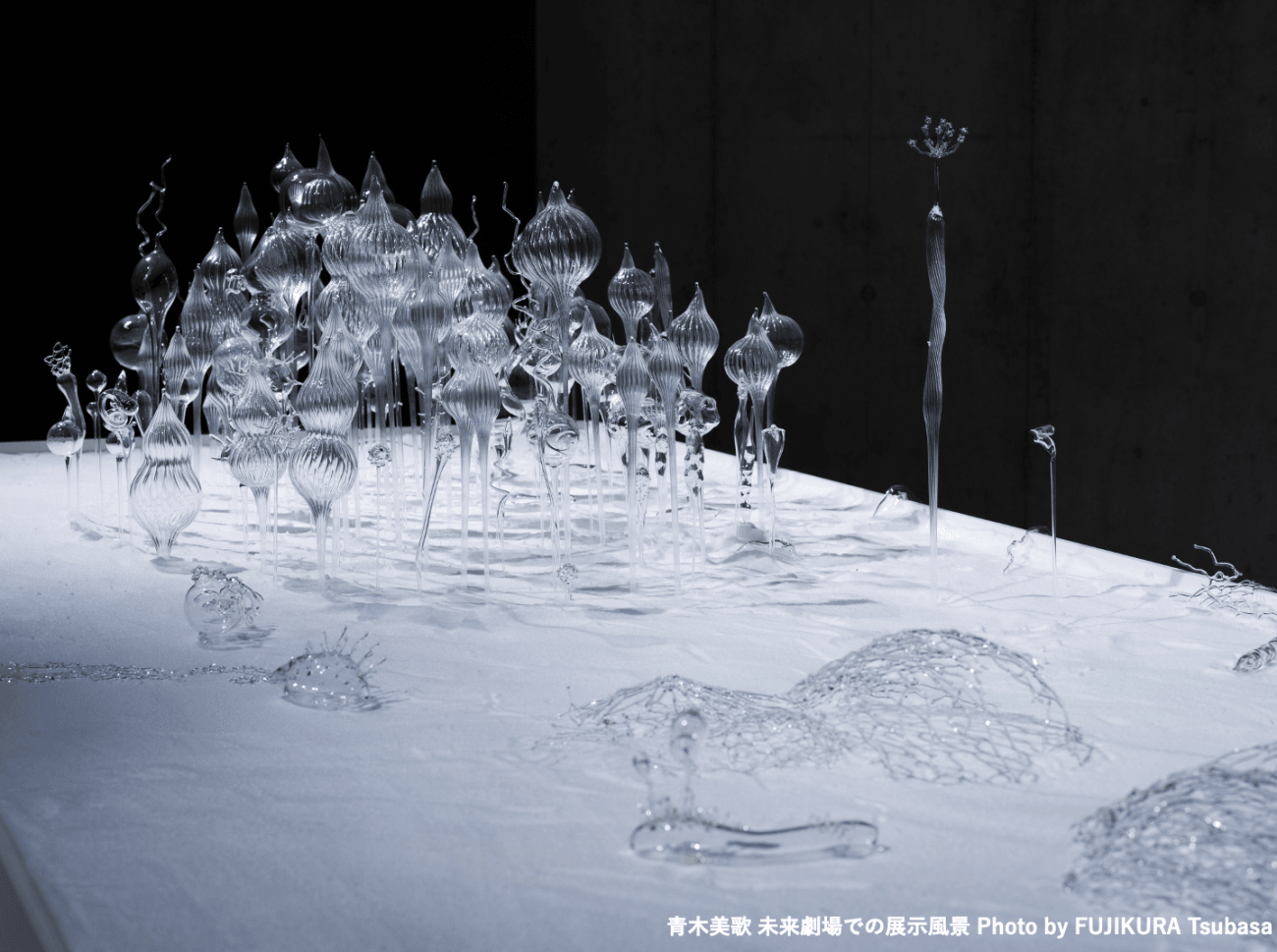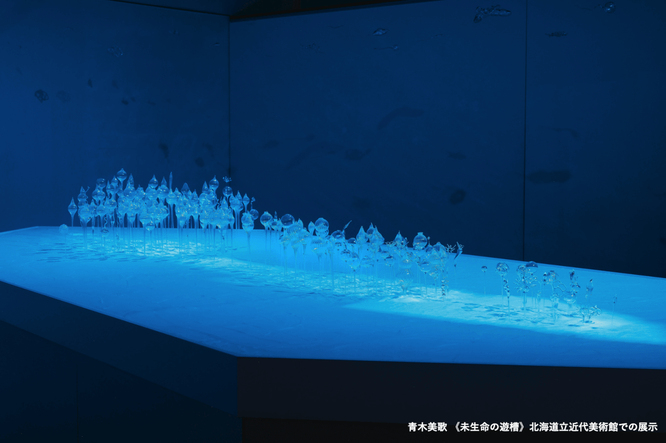 青木美歌さんは、1981年に東京で生まれ、札幌で育ちました。大学時代にガラスという素材に出合い、これからの創作活動を期待されていた最中、2022年に逝去されたアーティストです。青木さんは、未来劇場の奈落の展示スペースに、その繊細で魅惑的な造形力を持ったガラスの作品で、儚くも強い煌きを生み出してくれました。その中核となった作品が、青木さんの最大級のインスタレーション(空間作品)である《未生命の遊槽》で、展示空間の最後に展示されていました。