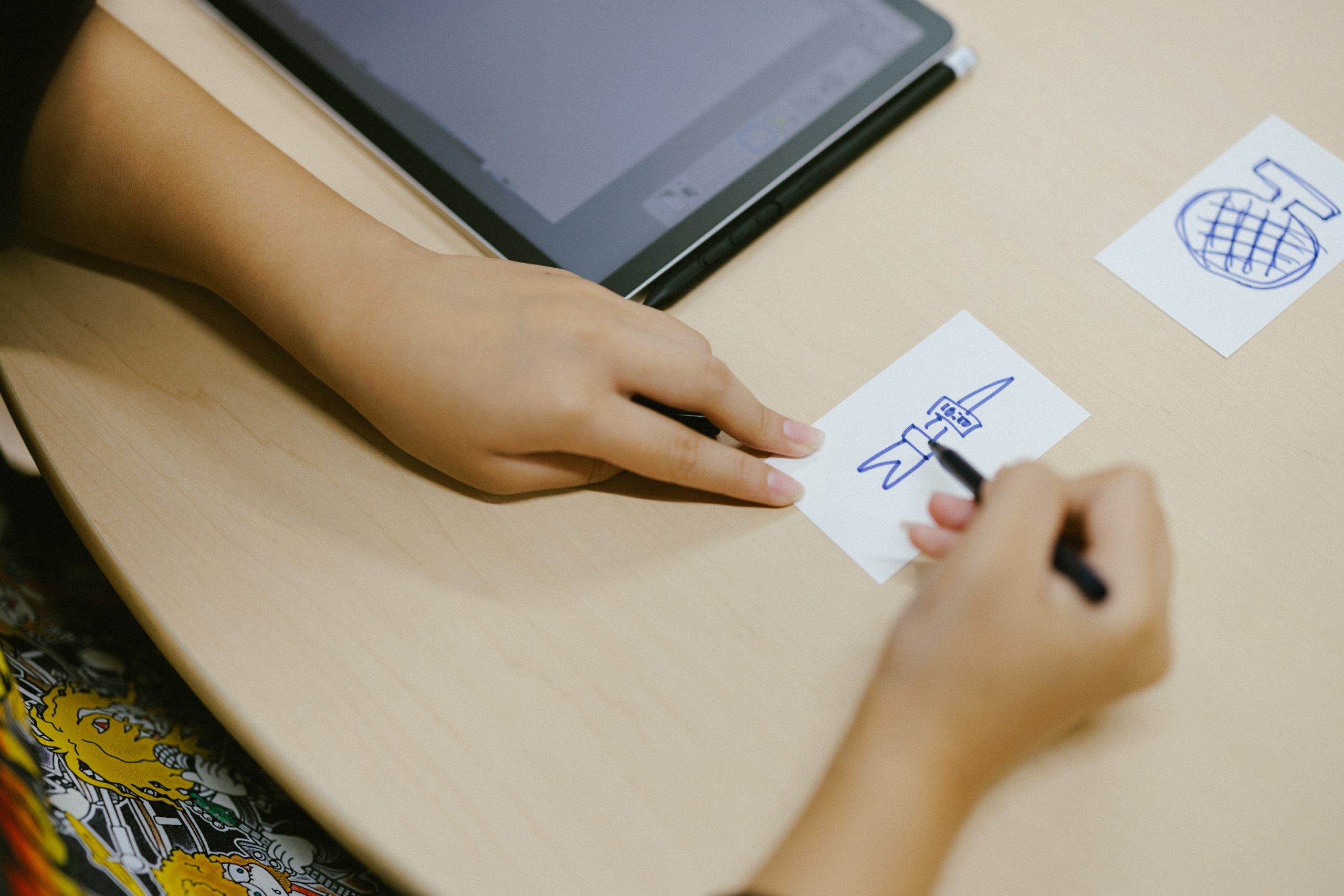 ワコムは電磁誘導のしくみをデジタルペンと組み合わせ、高性能なペンタブレットを発明したとのことです。それと同じように、児童のみなさんにも、別々のものを独自の発想で自由に組み合わせ、全く新しいもの(=モンスター)を生み出してほしい!という言葉で前半のレクチャーは締めくくられ、いよいよ制作開始です。