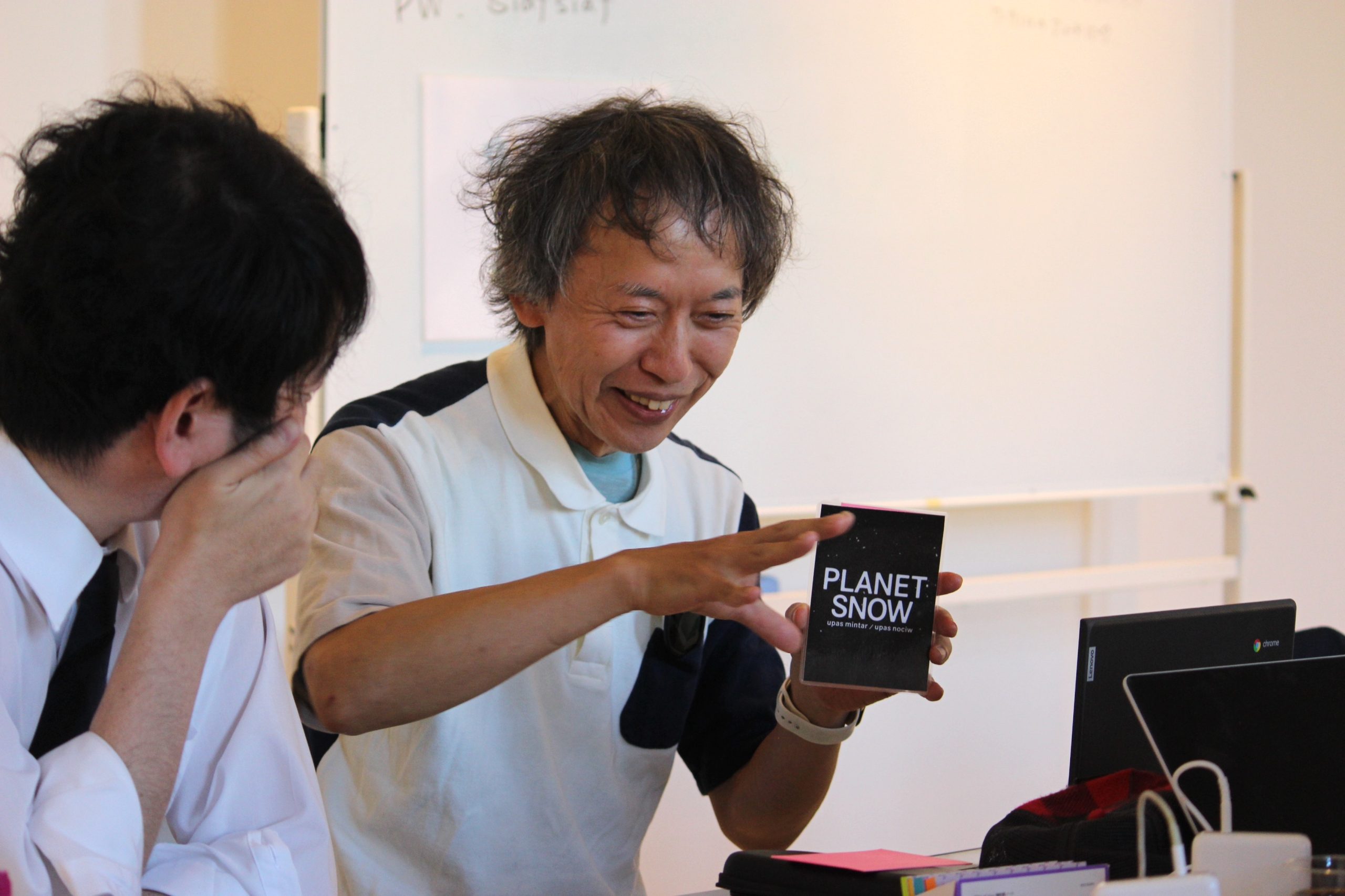 今回の教育喫茶は、この鑑賞プログラムを開発しているSIAF2027スクールディレクターの漆崇博と、フェスティバルディレクターの細川麻沙美の2名が店長(講師)を務めました。また本プログラムの開発にあたっては、南幌町立南幌中学校の美術教諭である佐藤祈先生に監修していただいています。