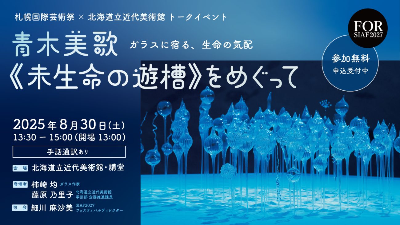 札幌国際芸術祭2024で北海道初公開され、多くの人が足を止めた青木美歌の作品《未生命の遊槽》が、北海道立近代美術館のコレクションになりました。今回のトークイベントでは「ガラス」「コレクション」「制作方法」などを切り口に、作家の人生と作品の魅力を初めての方にもわかりやすくお届けします。