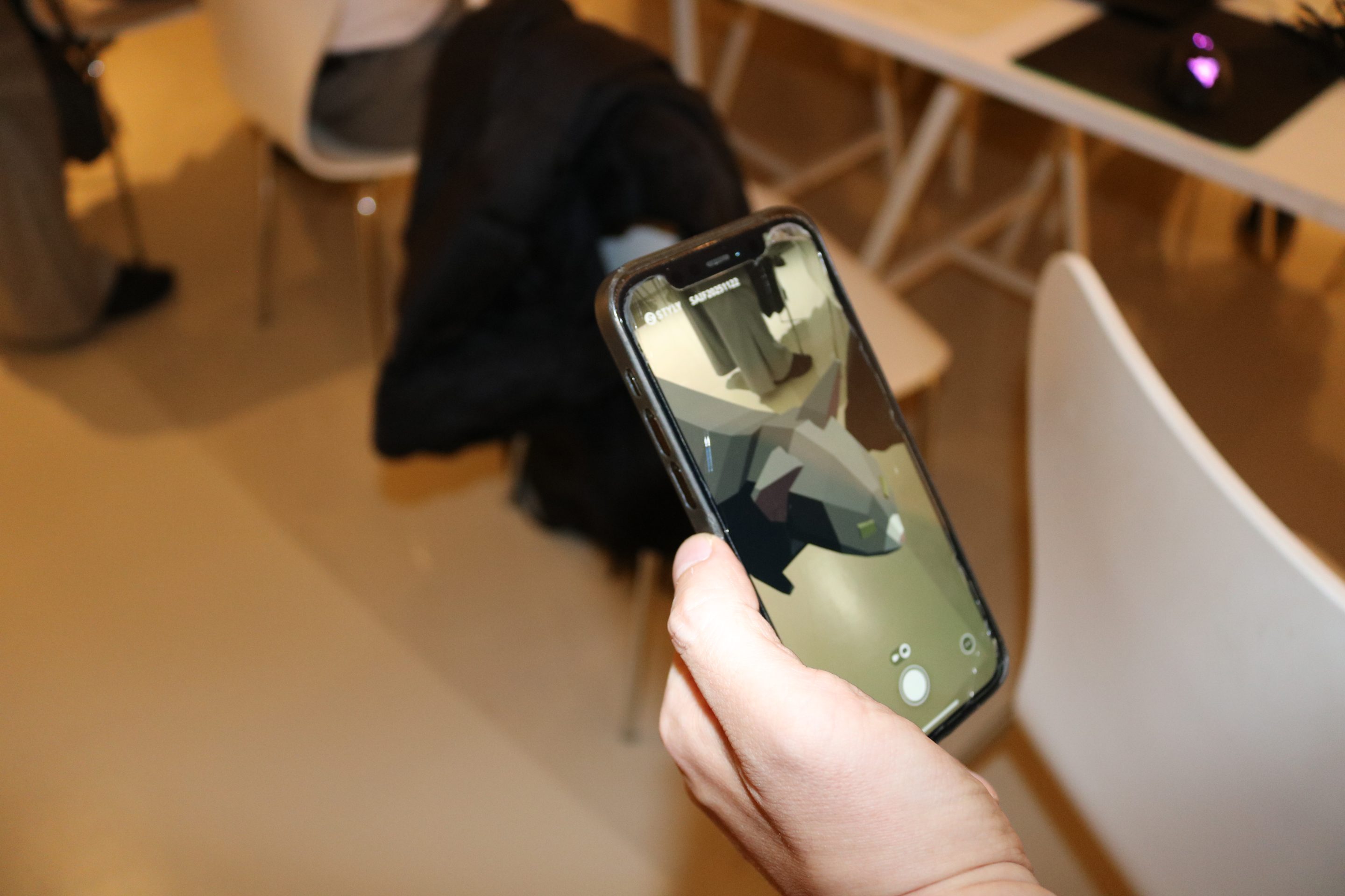 それぞれ自由なシーンを完成させた後 生成された二次元コードをスマートフォンで読み込むと スマートフォンの画面上の現実空間に自分の配置したオブジェクトが表示されます 読み込みを終えたみなさんは立ち上がり スマートフォンを片手に会場内を歩き回りながら自分の作品を探していました