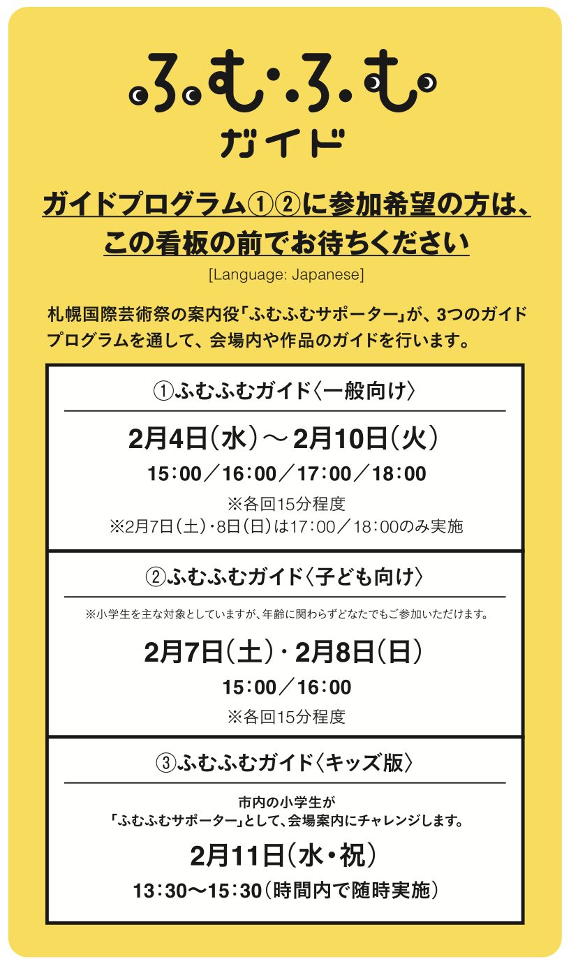 札幌国際げいじゅつさいの案内役ふむふむサポーターが 3つのガイドプログラムを通して会場内のご案内や作品ガイドを行います 参加費用はかかりません