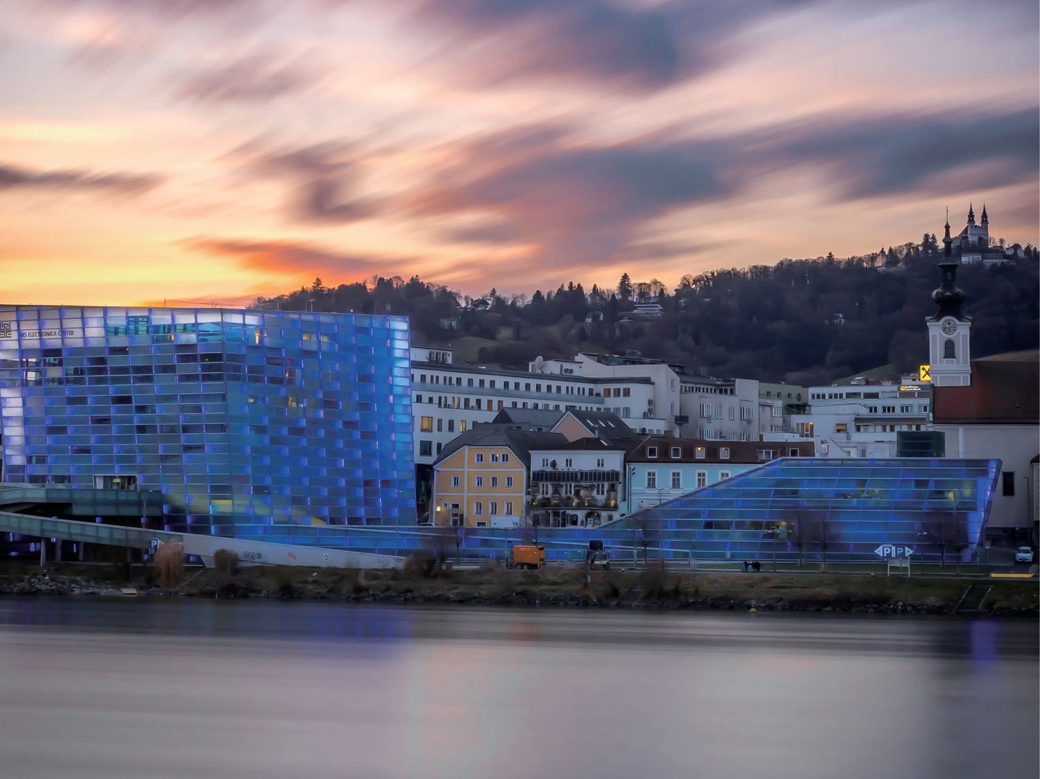 未来のミュージアムであるアルスエレクトロニカセンター 奥には巡礼教会のあるリンツの名所ペストリンクベルクが見えます