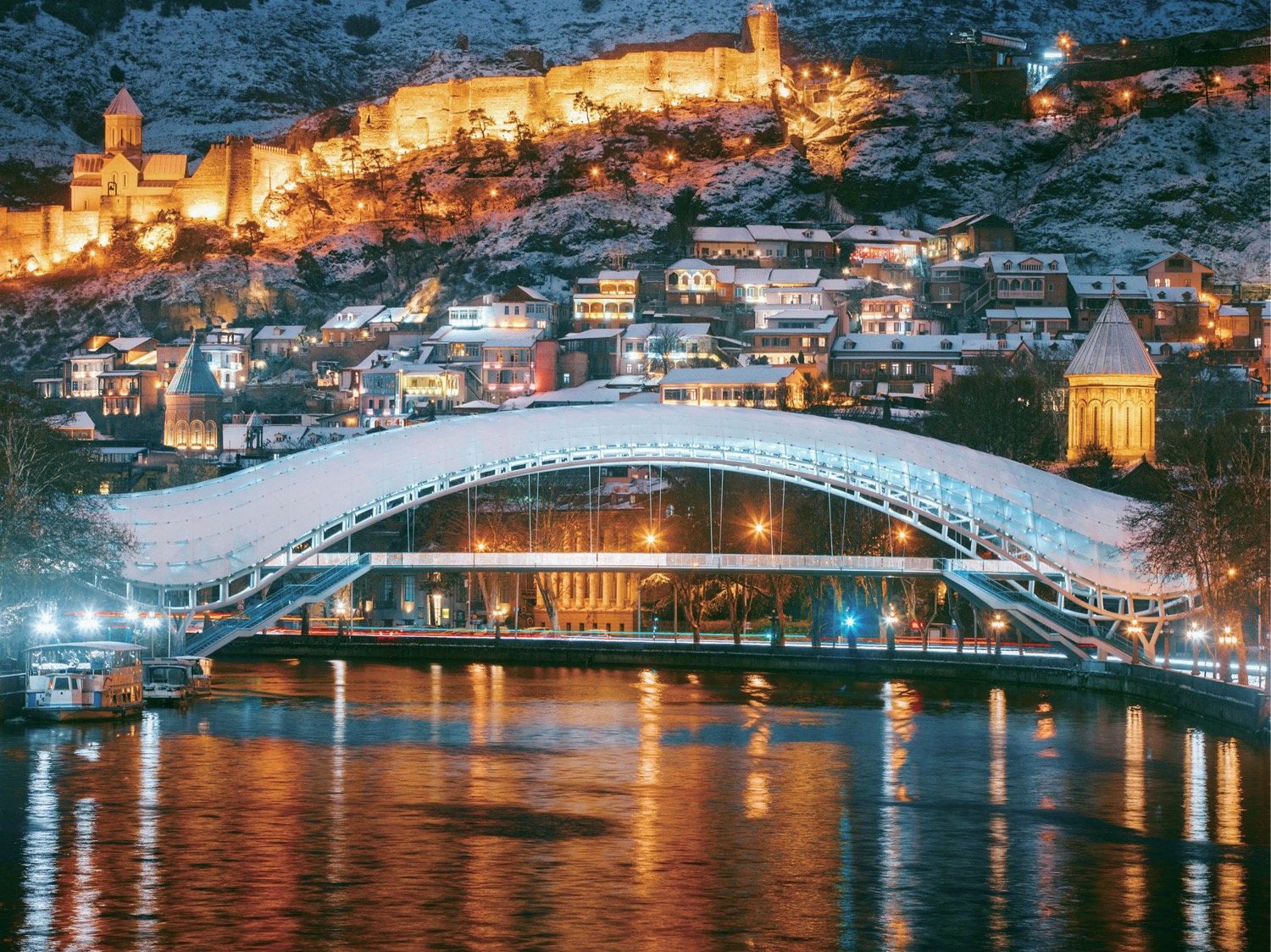 ムトゥクヴァリ川に架かる平和の橋を中心に捉えた冬の夜景 うっすらと雪に覆われた歴史ある旧市街とナリカラ要塞が美しくライトアップされている