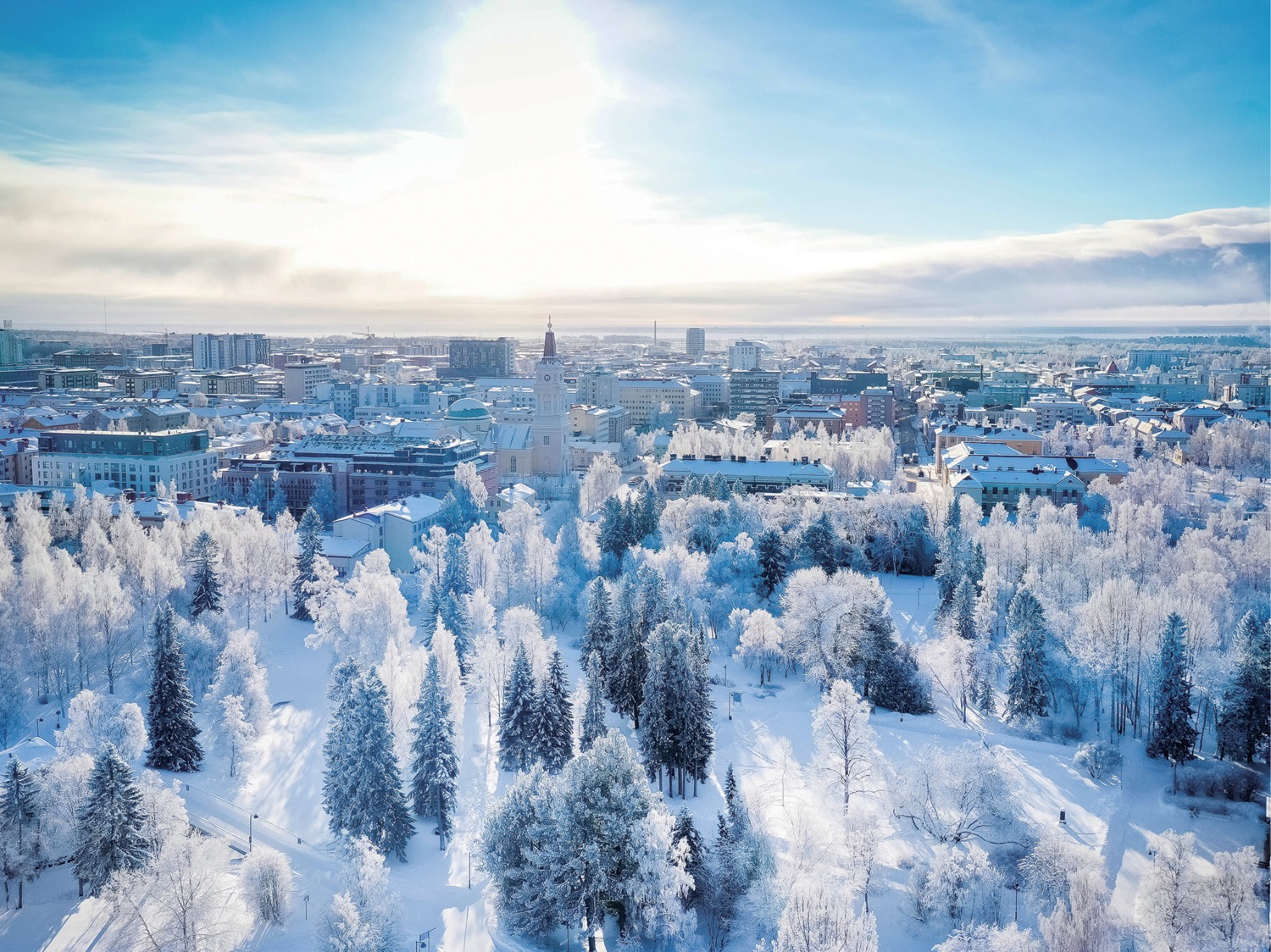 オウルの中心市街地と市内の公園を写した空撮写真