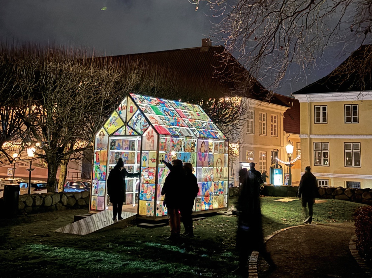 希望の天使がテーマのクリスマスインヴィボーフェスティバルで展示されたガラスのポータル 世界各地の創造都市の天使のドローイングが組み込まれています