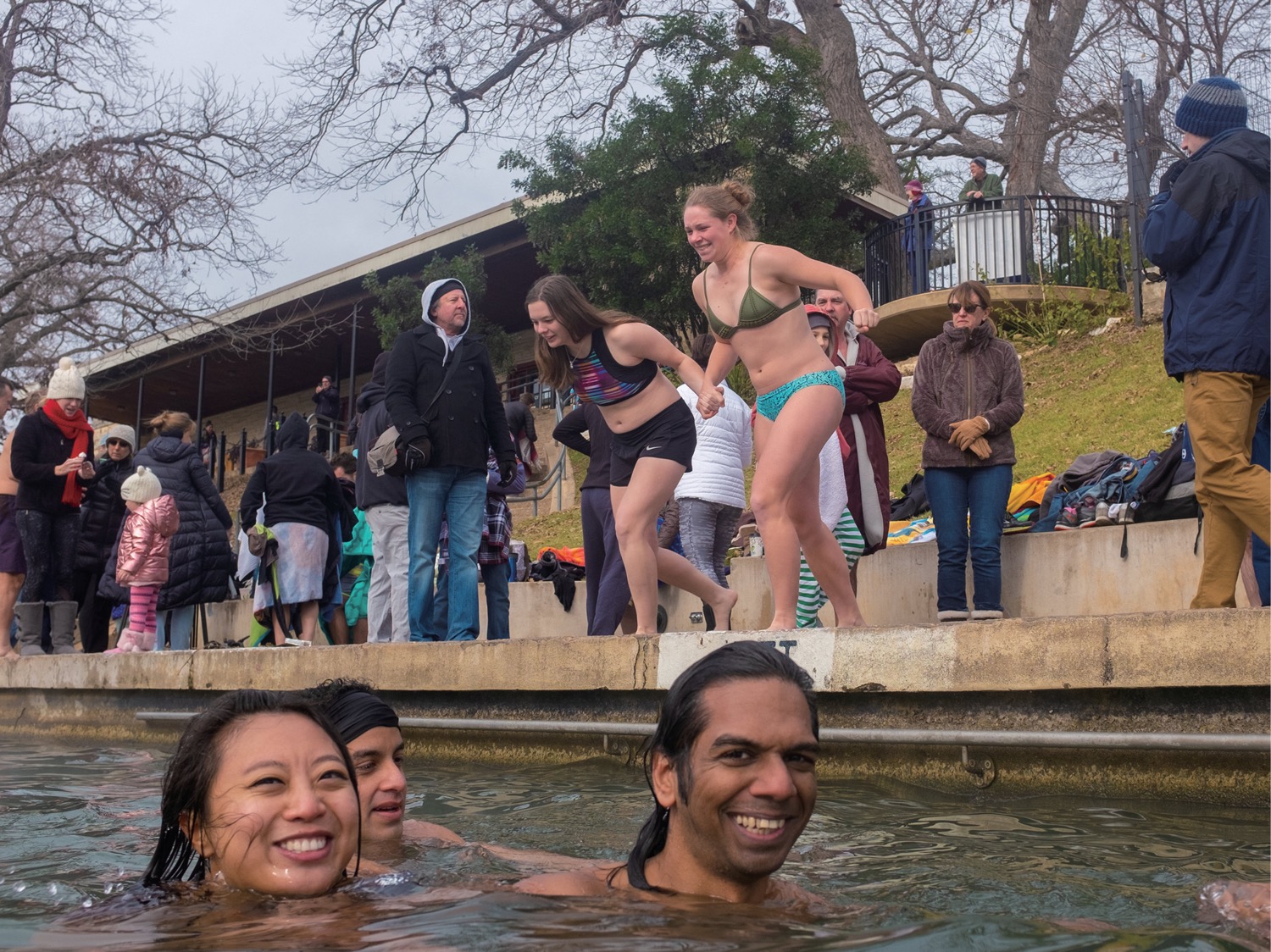 毎年元日に行われる恒例行事ポーラープランジでは 数百人の市民がバートンスプリングスプールに飛び込みます
