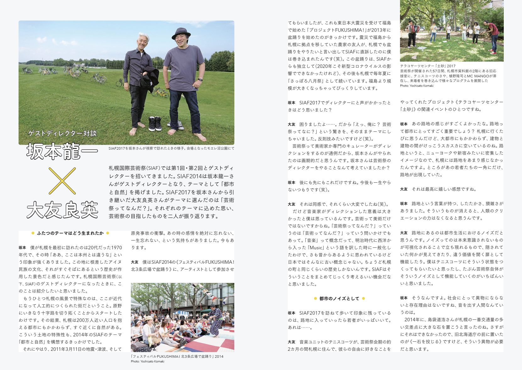 坂本 だからサイアフ2023は それこそ形だけ整えたって意味がない この先の数年で近代が見直され 人と自然との関係が検証され その結果今までにないげいじゅつさいができる可能性があります それは新しい都市や社会の形を提案するものになるかもしれない 市民のみなさんも コロナ禍で精神的にも経済的にも落ち込んだかもしれないけれども よりよい未来を築くんだという気持ちで参加してほしい とにかく続けて開催してほしいですね 僕と大友さんが礎になったんだから笑